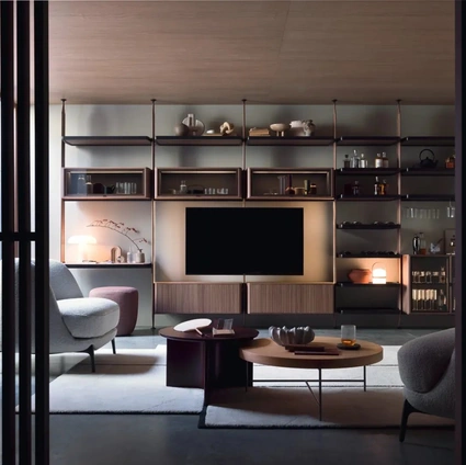 Per informazioni e preventivi sulla Parete Attrezzata Mensole e piani a muro di Novamobili nella fotografia contattaci! Il modello proposto è realizzato in legno, ma grazie ad una vasta gamma di texture, cromie e forme, potrà adattarsi a stili di ogni tipo. Questa parete attrezzata è una delle soluzioni del marchio e ti consentirà di allestire il living secondo le più particolari problematiche abitative. Attraverso un gioco dinamico di accostamenti fra elementi a giorno o vani chiusi, le Pareti Attrezzate moderne arredano il living sfruttando bene ogni spazio.
